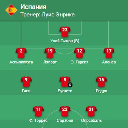 Испания: Симон, Аспиликуэта, Гарсия, Ляпорт, Маркос Алонсо, Бускетс, Родри (Форнальс, 85), Гави (Коке, 75), Оярсабаль, Сарабия (Пино, 61), Ферран Торрес (Мерино, 85)